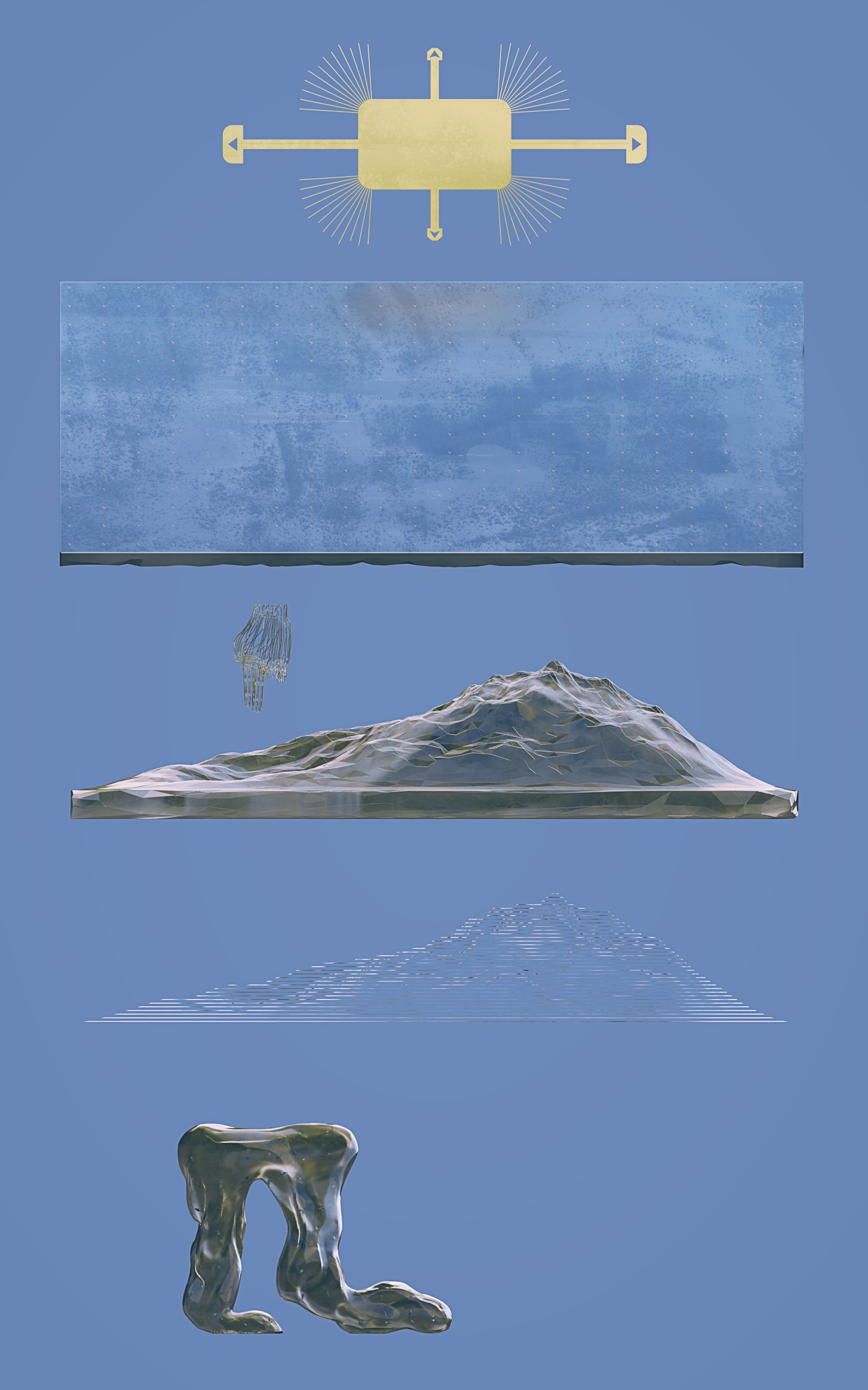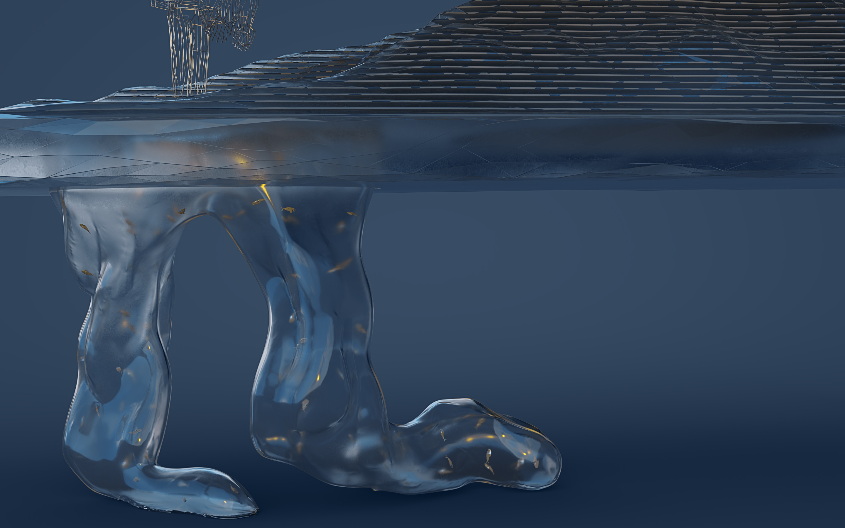 L'eau partant du plateau terrestre contient des poissons symbolisant l'humanité.
